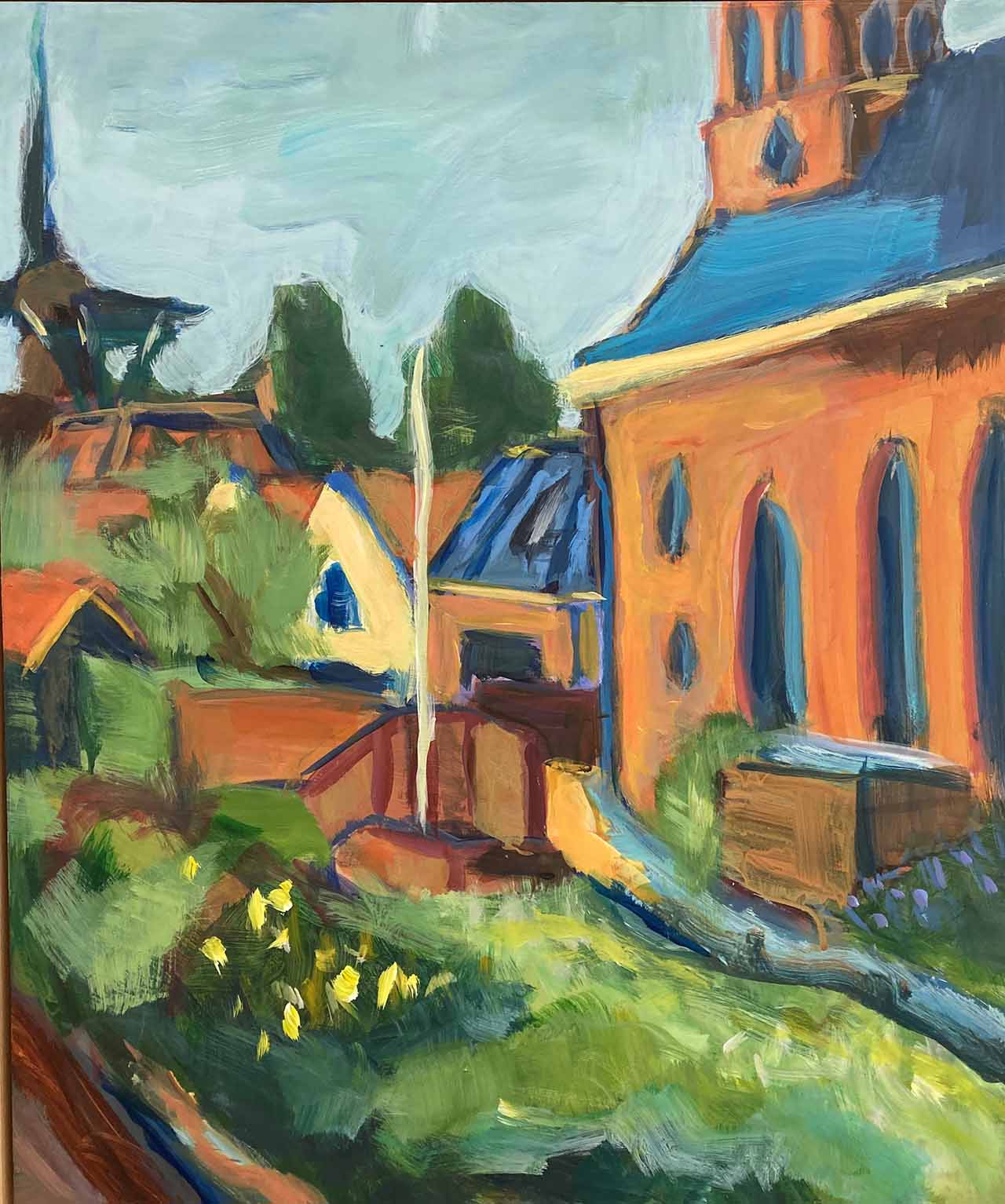 SchilderMarianne Brouwer (1993)Titel schilderijWoudsend, doorkijkje Midstrjitte naar St Michaëlskerk en molen het LamDatering2021Afmetingen50×60Overige informatieAcryl op paneel